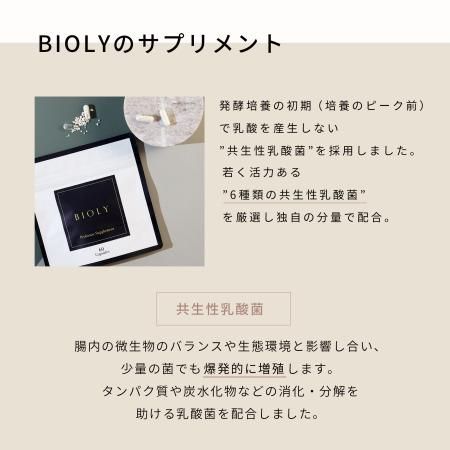 商品詳細 | BIOLYのサプリメントは発酵培養の初期(培養のピーク前)で発酵を止めた“共生性乳酸菌”を採用。若く活力のある“6種類の共生性乳酸菌”を厳選し、タンパク質や炭水化物などの消化・分解を助ける乳酸菌を独自の分量で配合しました。